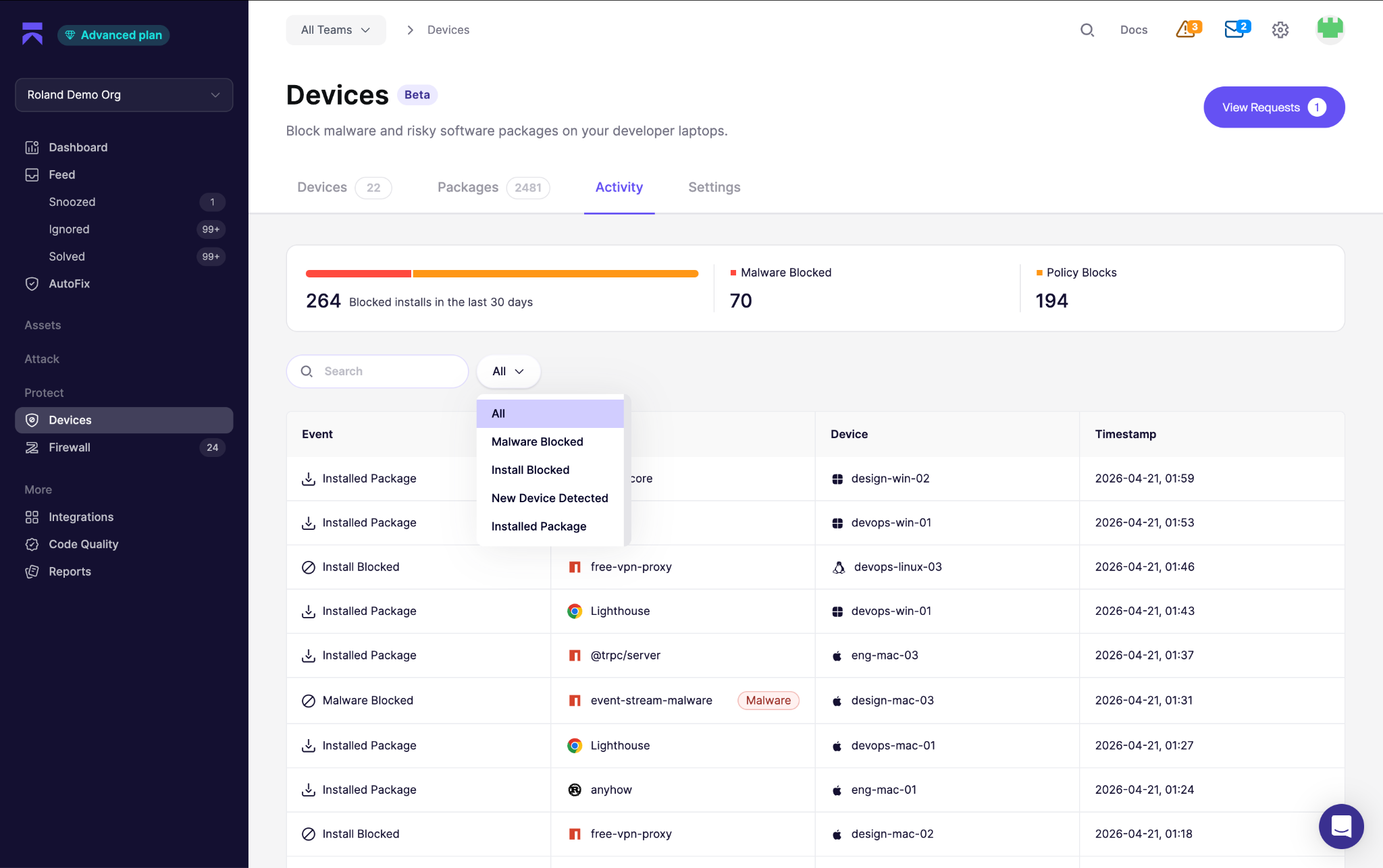 - Verschaffen Sie sich einen vollständigen Überblick über Ihre Software-Lieferkette: Sehen Sie sich jede Browser-Erweiterung, Code-Bibliothek, jedes IDE-Plugin und jede Build-Abhängigkeit an , die auf den Geräten Ihres Teams installiert ist.