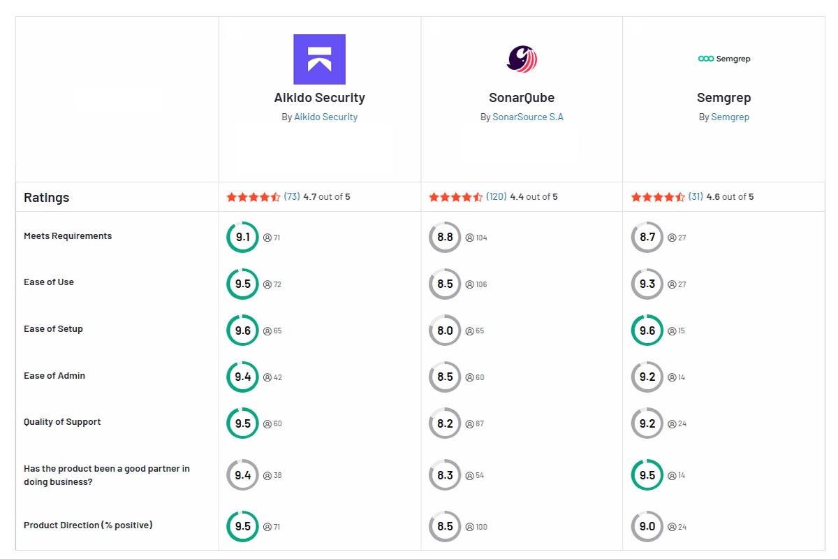 Zusammenfassend lässt sich sagen, dass beide Tools den Quellcode gut schützen, jedoch zusätzliche Tools für AppSec vollständige AppSec erfordern. Führende Teams sollten daher Plattformen wie Aikido in Betracht ziehen, die eine End-to-End-Abdeckung bieten.